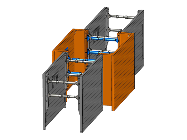 A trench width from 1.91 m to 4.71 m is possible using the standard strut and the strut extensions. The struts are bolted to articulated spring mushroom fittings, which are connected to the plates. Due to the rugged standard strut, the system can also be installed in poor or unstable soil conditions. The VB 60 Manhole Box is pushed vertically into the ground by alternately pushing and lowering (Dig and Push method).